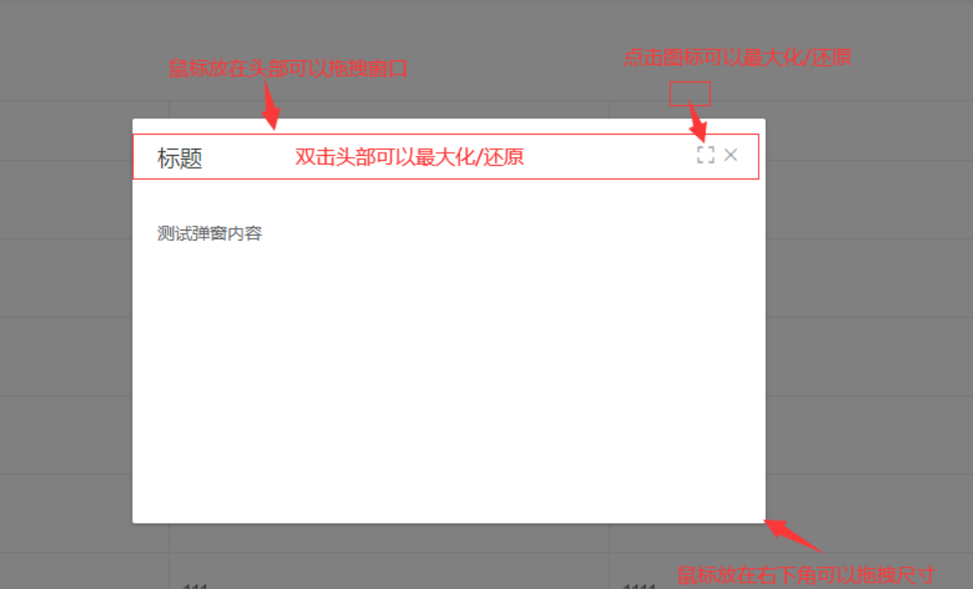 | full | boolean | 名称默认值为true,是否启用最大化/还原、拖动大小、可移动功能 | 否 |